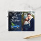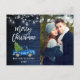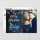 Rustic Wood Brush Script Watercolor Vintage Truck with Christmas Tree - Merry Christmas Couple Photo Postcard with Mason Jar String Lights. Blue Truck, Blue Wood.