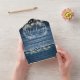 All in one wedding invitation featuring pretty string lights, a hand-drawn floral garland and chic typography on a blue rustic wood panels background. The invitation includes a perforated RSVP with your wedding website QR code and details. Designed by Thisisnotme©