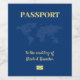 Blue and yellow passport destination wedding wine bottle label with world map. Personalise it with your name. Great for a pilot, a vacation or a frequent traveller.