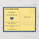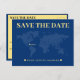 Blue and yellow world map wedding save the date card for a destination wedding. Personalise it with your event information.