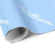 Blue wrapping paper with custom baby boy name. Cute idea for original baby shower presents.