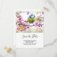 Save the date postcard with an amazing photograph of the cutest little bird perched on a branch covered in pink blossoms and green leaves. The bird has a blue head and yellow body with a very sweet face. Adorable.