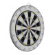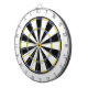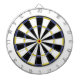 This dartboard is decorated with the colours Blue, Yellow, White, and Black.