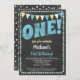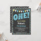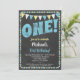 A funky chalkboard blue and yellow birthday invitation featuring chunky chalk text at the top with chalkboard background, flags and a cute polka-dot border.