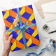 Blue, yellow & orange form shapes that create an optical illusion on this fun wrapping paper suitable for any occasion.