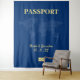 Blue passport backdrop for a destination wedding. Personalise it with your event details.