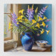 Blue Yellow Purple Bouquet Art. Capture tranquillity with this serene stylised watercolour still life of flowers in a vase with delicate blooms in blues, yellows, and purples. Perfect for wall art and greeting cards.
