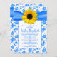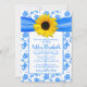 Yellow and blue floral damask and sunflower flower Catholic holy first communion invitation for her. This yellow sunflower and cornflower blue damask floral girls communion invitation is currently customised as a First Communion invitation, but it would work well as a confirmation, baptism, or christening invitation as well. Just change the wording. NOTE: This is a flat, printed design without any raised or 3D embellishments. The yellow sunflower flower and cornflower blue ribbon are printed on the paper.