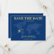 Blue and yellow world map wedding save the date card for a destination wedding. Personalise it with your event information.