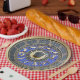Set of eight 9” paper plates with an image of a blue and gold zodiac wheel. See matching candy jar, mug, square ceramic tile and coasters. See the entire Gemstones & Medallions Plate collection in the HOME section.