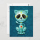 This adorable blue kitten design is decorated with swirls and dot patterns. Yellow flower pedals circle the pure black eyes in the tradition of the Day of the Dead sugar skulls. The cat is sitting down, looking forward with its tail waving in the background. The over sized head sits on a tiny body which creates a playful, cartoon like appearance. A five point star sits in the middle of the kitten’s forehead while a bright red and yellow heart appears in the centre of the chest. This cute little cat is a fun and stylish design inspired by the beautiful patterns of Day of the Dead sugar skulls.