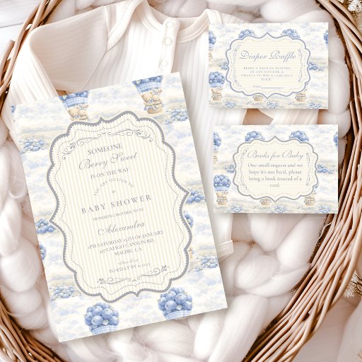 Blueberry Hot Air Balloon Toile Baby Shower Invitation