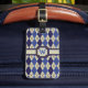 Argyle goes 8-bit with this preppy navy blue, denim blue, and khaki colour scheme with a rich brown contrast stitch creating a perfect look for lovers of this classic pattern. Customise the monogram with the appropriate initial and the details on the back for a personalised touch.