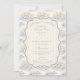 A sweet vintage-inspired design featuring delicate blue bows, soft striped detailing, and charming blueberry garden illustrations. Toile-style artwork with adorable animals and fruit baskets creates a classic storybook feel in a soft powder blue palette. The ornate central frame adds elegance while keeping the overall look light, refined, and timeless. Perfect for a baby shower with a gentle garden theme and a touch of traditional charm.