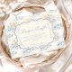 A sweet vintage-inspired design featuring delicate blue bows, soft striped detailing, and charming blueberry garden illustrations. Toile-style artwork with adorable animals and fruit baskets creates a classic storybook feel in a soft powder blue palette. The ornate central frame adds elegance while keeping the overall look light, refined, and timeless. Perfect for a baby shower with a gentle garden theme and a touch of traditional charm.