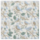 This patterned fabric has a fun print that's perfect for bird lovers and nature lovers. This illustrated material features simple illustrations of bluebirds perched on blueberry branches. The graphics are in light blue, light brown and dark green against a cream or ivory coloured background.