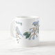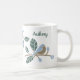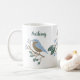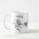 Create a berry sweet personalised gift. This coffee mug features simple illustrations of bluebirds perched on branches with blueberries. The graphics are in light blue, light brown and dark green. There's a spot to add a name on both sides of the mug in green script lettering.