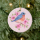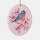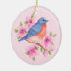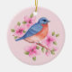 This ceramic ornament has my painting of a bluebird on a branch with pink flowers. The ornament is 2 5/8" and comes with a ribbon. You can add text on the back to personalise.