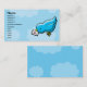 A customisable business card featuring a digital illustration of a cute little cartoon bluebird with a yellow beak and feet holding an envelope sealed with a heart in its beak. The background features some pastel clouds.