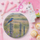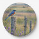 A bluebird is perched on a weathered wooden fence post with barbed wire surrounded by tall grass and purple wildflowers