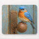 A small bluebird with vibrant blue and orange plumage perches on an old, rusty doorknob