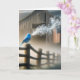 A bluebird perches on a wooden fence singing melodious notes that visually transform into swirls and musical symbols with American flag in the background