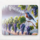 A bluebird sits on a grapevine, singing as misty musical notes flow from its beak