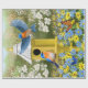 A pair of eastern bluebirds make their home in a cute yellow birdhouse within a beautiful spring garden filled blue and yellow daisies and surrounded by flowering dogwood. Orange and blue butterflies visit the flowers, too.
