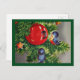 Retro greeting card art in bright colours. Two little bluebirds look at their reflection in a red ornament.