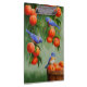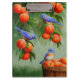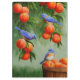 Two western bluebirds perch in a peach tree while a third bluebird sits on a basket filled with freshly harvested fruit ready for market. Realistic artwork created from an original oil painting by wildlife artist Crista S. Forest.