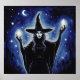 This fantasy poster features a mysterious witch with glowing eyes and hands standing under a starry night sky, surrounded by silhouettes of trees. The crescent moon lights her path, adding to the mystical atmosphere. MysticStarWitch is finished as an oil paint art print.