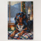 A heartwarming holiday scene featuring a dog sitting peacefully beside a window, surrounded by glowing Christmas lights. This cosy and festive design captures the spirit of the season, perfect for adding warmth and charm to any space. Ideal for dog lovers and holiday decor enthusiasts.