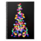 Celebrate the winter holiday season with this original, colourful, abstract photo of blurred Christmas lights. The bokeh created from the pink, red, orange, blue, green, and yellow lights form the shape of a Christmas tree. The background of the vertical image is black.
