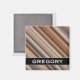 This magnet design features a blurry striped pattern inspired by rustic colours like shades of brown, grey, and beige. It also features a personalised name.