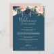 These blush and navy blue welcome letter & itinerary cards are perfect for a floral wedding. The classic and elegant design features modern watercolor navy blue and blush pink flowers on a teal blue background. The front of the card features a welcome letter and the back of the card features the wedding itinerary. These notes are perfect for destination weddings and hotel guest welcome bags.