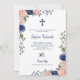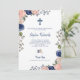 These beautiful religious Confirmation invitations feature pretty blush pink and navy blue hand painted watercolor flowers on a crisp white background. A boho chic and trendy style that also features a matching cross. A mix of bold, serif text and handwritten script.
