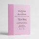 A soft blush pink paired with a deeper mauve pink, creating a warm, romantic contrast. Text is styled in rich burgundy, blending a clean serif font for the formal details with flowing script for the names and headings.