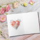 The front of this greeting card showcases a striking blush-coral sacred heart surrounded by intricate white lace filigree, hand-drawn Baroque flourishes, and soft distressed texture inspired by antique fresco walls. Subtle gold radiance emanates from the center, giving the artwork a luminous, heirloom feel. Inside, a coordinating version of the heart appears on the left panel, keeping the romantic theme unified. The back of the card includes a mirrored blush Baroque wallpaper pattern for a fully immersive design experience—perfect for those who love ornate, artisan stationery with nostalgic warmth.