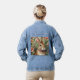 The Blush Blooms & Bunny Dreams jean jacket features a gentle tan and white watercolor bunny nestled among pastel pink flowers and lush green leaves, adding a delicate and heartwarming touch to your spring wardrobe.