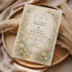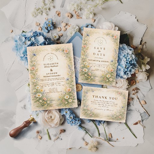A romantic meadow of soft watercolor blooms rises from the base of this elegant design, featuring blush cosmos, delicate daisies, buttery yellow florals, and airy blue wildflowers. The warm parchment background and refined gold typography create a timeless, sunlit aesthetic that feels both rustic and sophisticated. Light, airy, and beautifully balanced, this design captures the charm of a countryside celebration with classic polish. Perfect for couples who love garden romance with a refined finish.