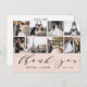 This elegant thank you postcards feature 8 photos with "thank you" in calligraphy script along with couple names and wedding date. The back of this postcard features plenty of room to write out a personal heartfelt thank you note, along with lines for the mailing address.