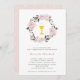 This sweet and elegant religious First Holy Communion invitation features a muted, vintage look blush pink wreath with watercolor peonies and roses, and dark grey foliage and leaves, on a white background. A communion chalice is also featured, and the back of the invitation is a soft blush colour with cute white polka dots.