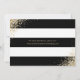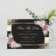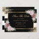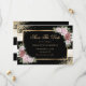 Elegant black and white striped floral wedding save the date card featuring blush pink flowers and greenery framing the wedding details inside a gold frame against a black and white background adorned with gold confetti. Black and gold floral wedding save the date card.