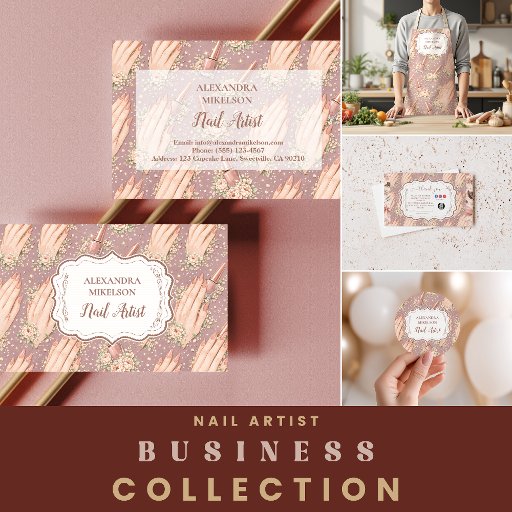 An elegant and feminine business design featuring delicate blush florals combined with stylish nail polish illustrations. The soft vintage-inspired palette and romantic botanical details create a luxurious beauty aesthetic perfect for modern nail artists and beauty professionals. The refined frame and floral elements give the design a boutique, high-end feel that works beautifully for salons, nail technicians, and independent beauty businesses. Ideal for creating a polished and memorable first impression for your beauty brand.