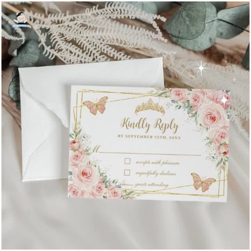 Blush Floral Princess Quinceañera Gold Crown Dress RSVP Card