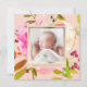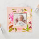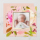 Beautiful watercolor floral bouquet with greenery and berries, and faux gold framed photo on blush background trendy and elegant birth announcement.