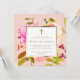 Beautiful watercolor floral bouquet with gold colour cross, greenery, berries, and faux gold frame on the front of the card, and blush background with white polka dot pattern on the back of this trendy and elegant baptism invitation.