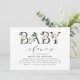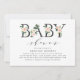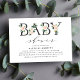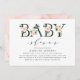 Stylish, elegant baby shower invitations featuring charcoal grey letters with blush watercolor flowers and green foliage accents. The floral elements are complimented by a modern calligraphy script font. Personalise the floral baby shower invitations by adding your details. The reverse side of the invitations feature a blush pink watercolor background.