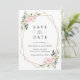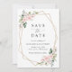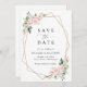 Invite friends and family in style and set the tone for your special day with this charming save the date card. Design features blush pink watercolor flowers, greenery and gold frame on white background.
