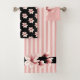 Chic bath towel set done in blush and black, with stripes and lovely graphics of blush coloured magnolia blooms. This lovely statement bath towel set has matching home decor available.